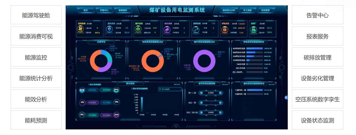 根據《煤礦及重點非煤礦山重大災害風險防控建設工作總體方案》要求,自主研發的礦山(煤礦)重要設備用電監測系統,幫助煤礦行業能耗體加強能源消耗日常調度、提升能源管理精細化水平、開展能源審計、審查以及節能改造投資等提供決策支撐服務。