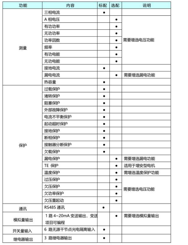 5、完善的電動機保護功能:基本保護包括(起動超時保護、過載、堵轉、斷相、電流不平衡、接地、欠載.阻塞等)還可以根據需要增選保護功能(漏電保護、溫度保護、過壓保護、欠壓保護、欠功率保護等)
