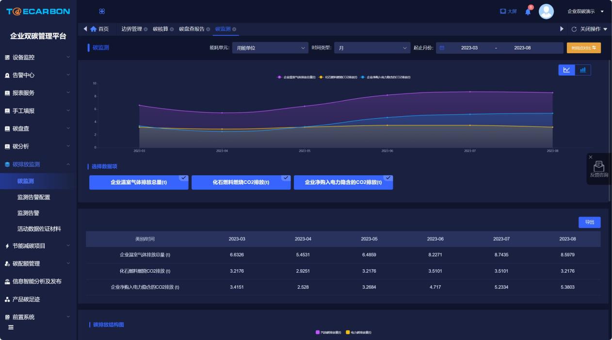 數字化能碳管理系統平臺是支撐工業企業和園區提升能耗雙控和碳排放雙控管理水平的信息系統,是加強工業節能降碳管理,推進數字技術賦能綠色低碳轉型的基礎工具。可幫助企業申報綠色工廠和零碳園區,滿足《工業企業和園區數字化能碳管理中心建設指南》中十二項功能,即能耗查詢、能源消費量和強度計算、能源消費分析與用能策略推薦、能效對標、能流分析、能效平衡與優化、用能與碳排放預算管理、碳排放、碳足跡核算、供應鏈碳管理、碳核查支撐、碳資產管理等功能。
