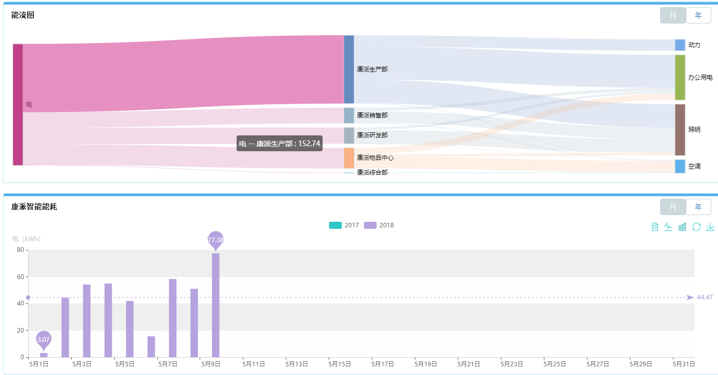 該功能可以實現對企業整體、部門、設備耗能的變化趨勢進行統計并與同期的耗能進行分析對比;可對電量指標進行綜合分析(電量電費分析、負荷特性分析、電價時段分析、功率因數分析)。通過數據的支撐和對比分析,為企業用能的改善提供科學的數據支撐。