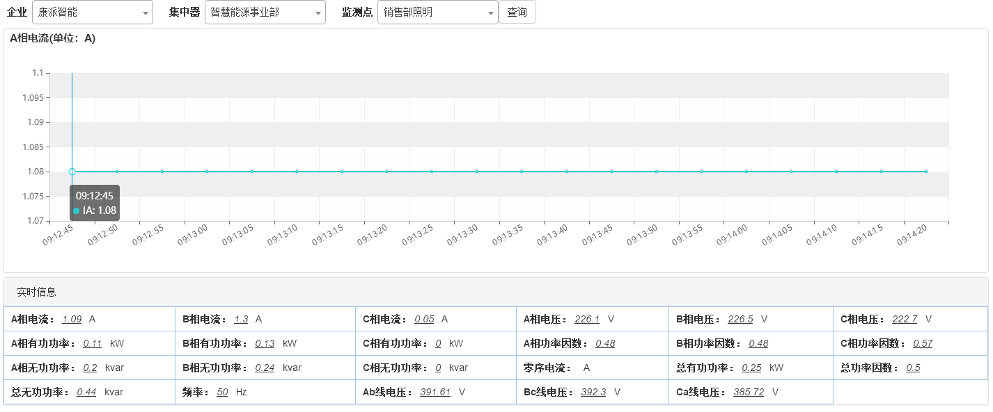 秒級實時數據主要展示用電設備電壓、電流、有功功率、無功功率和功率因數等數據,每5鐘刷新一次。選擇集中器,選擇監測點,點擊查詢就會調出當前用能設備分鐘級實時數據。點擊數據變量,就會生成與之相對應的實時曲線,通過曲線查看數據情況,進而了解設備運行情況。