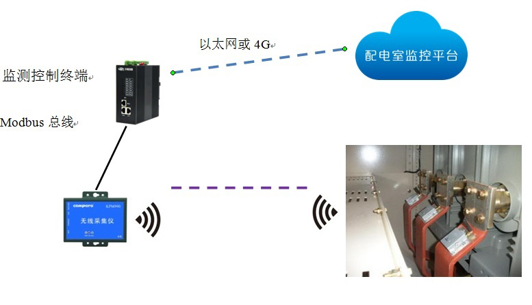 針對母排搭接處放置智能無線測溫傳感器,實時動態監測母排溫度變化情況;在配電室或箱式配電室構建局部的無線基站,收集無線智能終端采集的數據,每十五分鐘主動巡檢一次,實現超溫主動報警機制,避免長期高溫運行,造成絕緣件老化。