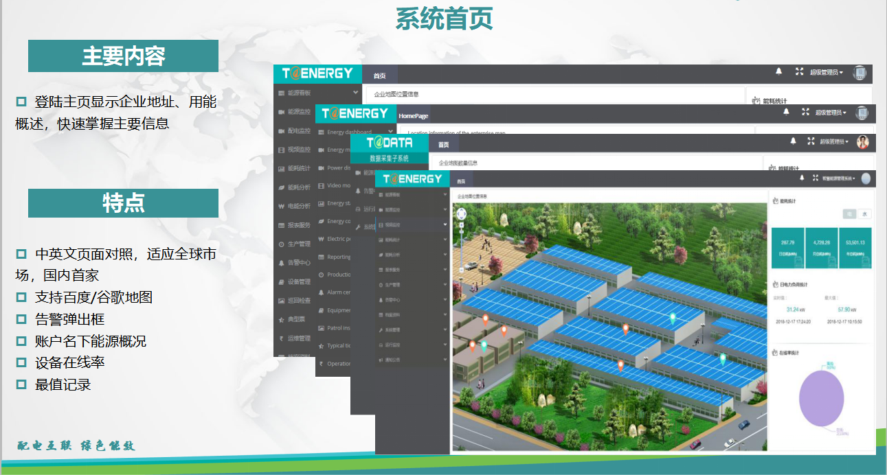 能源管理系統(tǒng)首頁界面的主要內(nèi)容:登陸主頁顯示企業(yè)地址、對(duì)企業(yè)用能情況進(jìn)行概述,幫助企業(yè)快速掌握主要信息。
