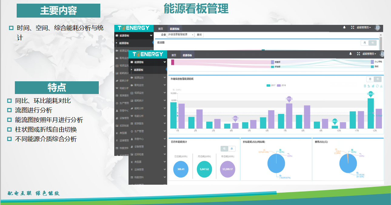 能源看板的主要內(nèi)容是時(shí)間、空間、綜合能耗分析與統(tǒng)計(jì),幫助用戶進(jìn)行同比、環(huán)比能耗對(duì)比,對(duì)能流圖進(jìn)行分析,實(shí)現(xiàn)不同能源介質(zhì)的綜合分析。
