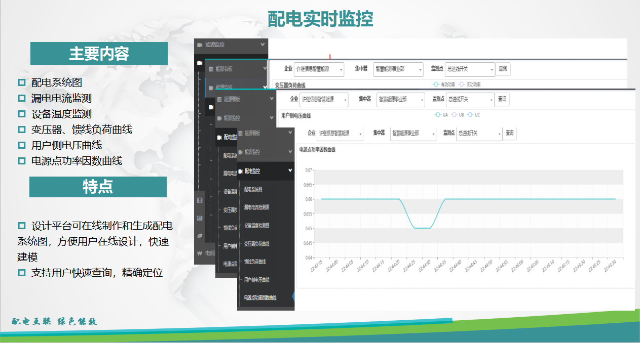能源管理系統(tǒng)配電實(shí)時(shí)監(jiān)控界面涉及配電系統(tǒng)圖、漏電電流監(jiān)測、設(shè)備溫度監(jiān)測、變壓器、饋線負(fù)荷曲線、用戶側(cè)電壓曲線、電源點(diǎn)功率因數(shù)曲線,幫助用戶快速查詢?cè)O(shè)備狀態(tài),快速建立系統(tǒng)模型。