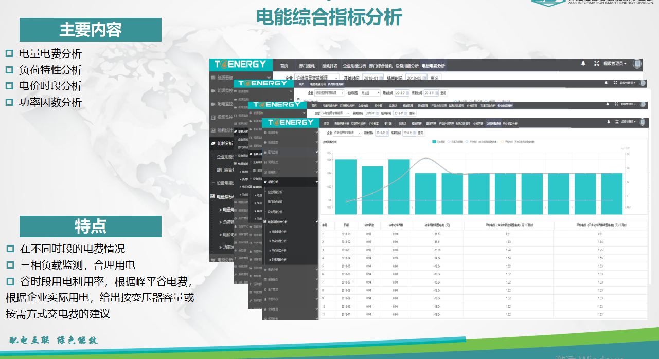 能源管理系統(tǒng)的電能綜合指標(biāo)分析界面主要涵蓋四方面內(nèi)容:電量電費(fèi)分析、負(fù)荷特性分析、  電價(jià)時(shí)段分析、功率因數(shù)分析。