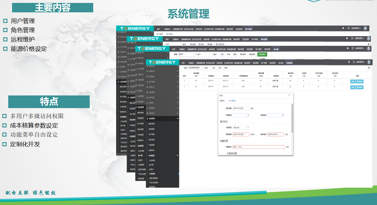 能源管理系統(tǒng)的系統(tǒng)管理界面主要有用戶管理、角色管理、遠(yuǎn)程維護(hù)、能源價(jià)格設(shè)定等功能,實(shí)現(xiàn)用戶的層級(jí)訪問和功能菜單自由設(shè)定。