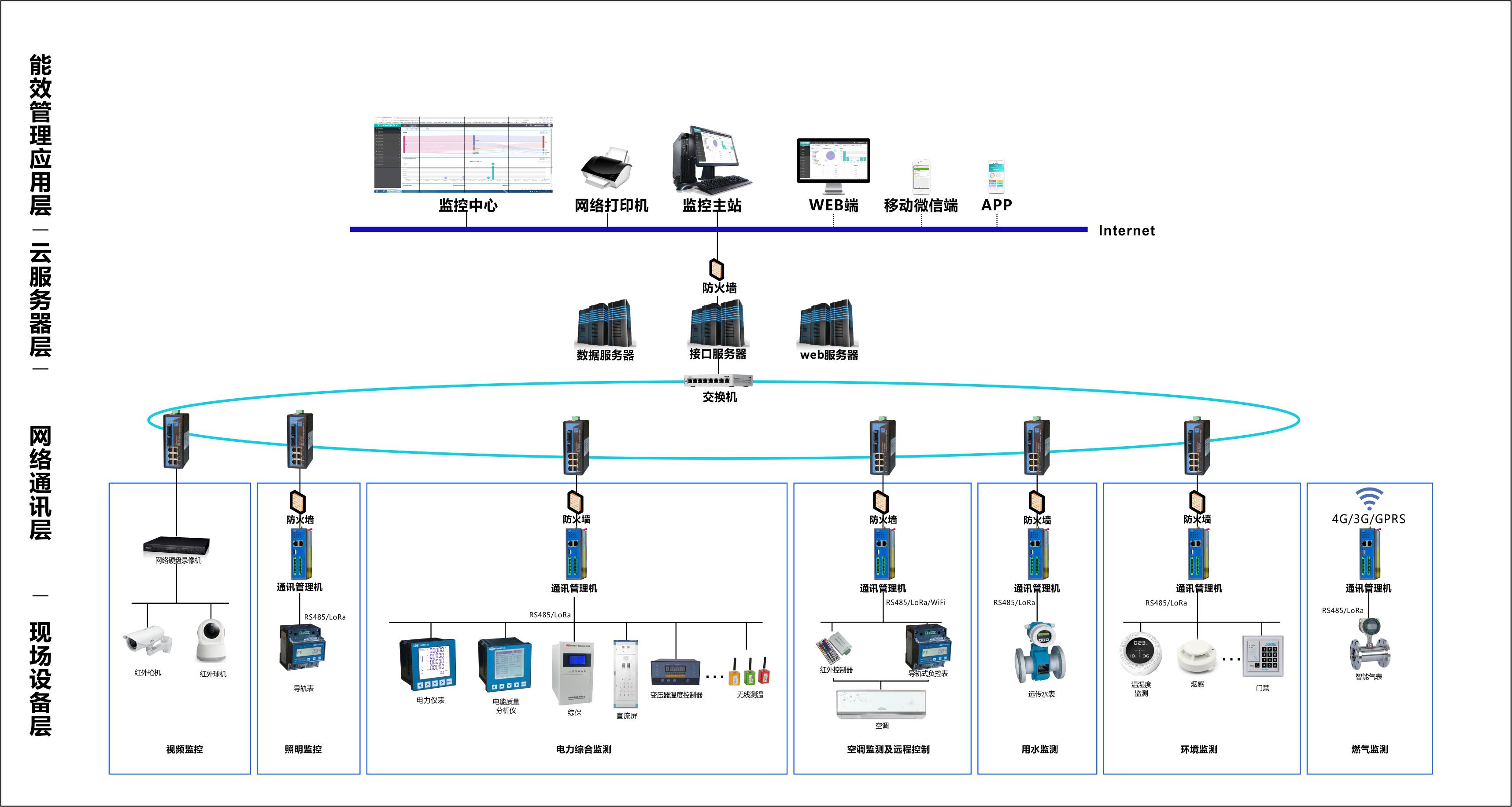 現(xiàn)場采用RS485、以太網(wǎng)GPRS、4G、NB-ot.lora、 Zigbeeifi等傳輸方式,將區(qū)域內(nèi)的電力采集模塊連接至對(duì)應(yīng)的通訊管理機(jī);各通訊管理機(jī)通過用戶局域網(wǎng)連接至中央服務(wù)器。