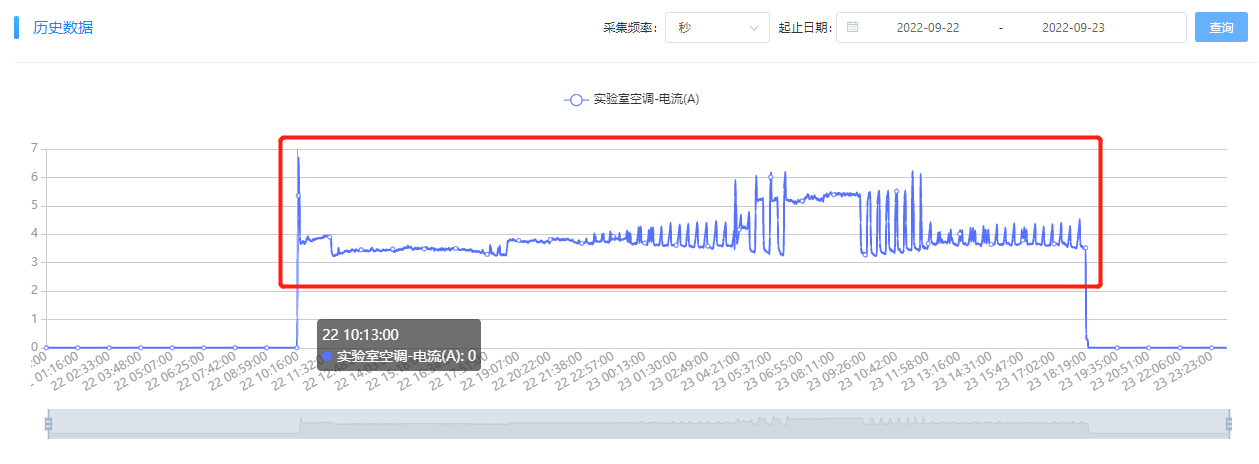 異常用能確認。根據“能源監控—歷史數據分析”來進一步確認異常點的異常數據,9月23日的用能異常確實是“嵌入式組-實驗室-空調”設備未關機造成的。拉取9月22日至9月23日數據,發現,該嵌入式研發實驗室的空調在9月22日上午10點開機后,至次日9月23日下午17點35分左右關機,9月22日未關機。