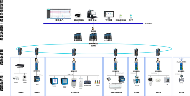 現場設備層:主要是連接于網絡中用于水、電、氣等參量采集測量的各類型的儀表等,也是構建該配電、耗水、耗氣系統必要的基本組成元素。肩負著采集數據的重任,這些設備可為本公司各系列帶通訊網絡電力儀表、溫濕度控制器、開關量監測模塊以及合格供應商的水表、氣表、冷熱量表等。