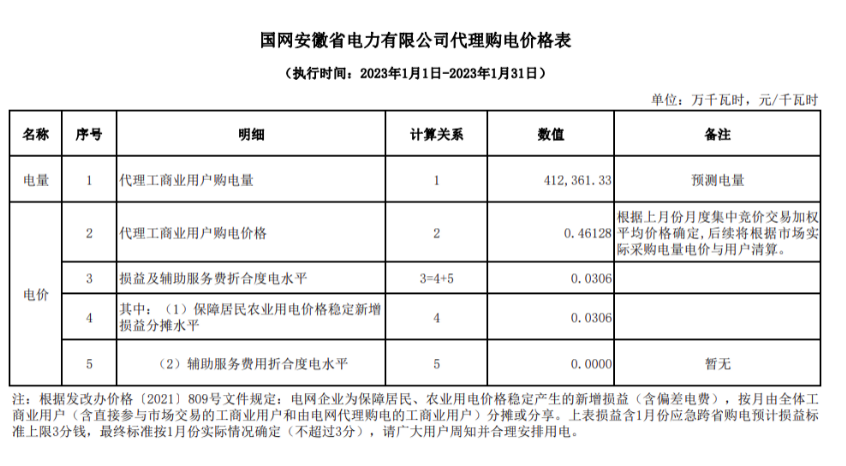 注:根據(jù)發(fā)改辦價格{2021}809號文件規(guī)定:電網(wǎng)企業(yè)為保障居民、農(nóng)業(yè)用電價格穩(wěn)定產(chǎn)生的新增損益(含偏差電費(fèi)),按月由全體工商業(yè)用戶(含直接參與市場交易的工商業(yè)用戶和由電網(wǎng)代理購電的工商業(yè)用戶)分?jǐn)偦蚍窒?。上表損益含1月份應(yīng)急跨省購電預(yù)計損益標(biāo)準(zhǔn)上限3分錢,最終標(biāo)準(zhǔn)按1月份實(shí)際情況確定(不超過3分),請廣大用戶周知并合理安排用電。