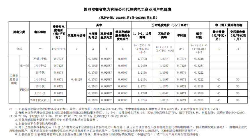 安徽省工商業(yè)用戶電價及尖峰平谷時段劃分段