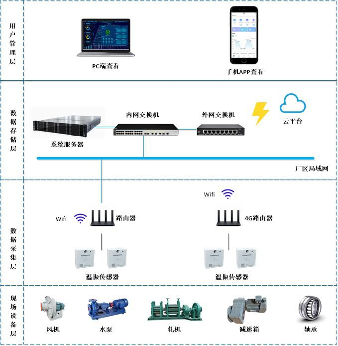 項目方案設計應用智能傳感、物聯網、移動通訊、大數據分析和人工智能技術等先進技術。在關鍵設備表面安裝振動、溫度等智能采集硬件,智能采集設備通過廠區(qū)Wifi網絡,將數據上傳至本地服務器/云服務器,實現關鍵設備運行狀態(tài)數據實時采集;平臺端進行數據處理與存儲,實現設備狀態(tài)實時顯示、異常智能預警、數據分析、操作記錄、報表統(tǒng)計等設備狀態(tài)監(jiān)測業(yè)務。