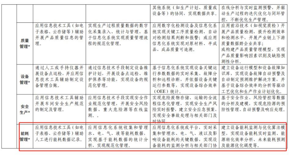 數字化基礎、管理及成效評測表包括網絡建設、設備數字化、設備聯網、數據采集、信息系統、信息安全、規劃實施、管理機制、人才建設、資金保障、綠色低碳、產品質量、市場表現、價值效益等指標。數字化經營應用場景等級判定表包括產品設計、工藝設計、營銷管理、售后服務、計劃排程、生產管控、質量管理、設備管理、安全生產、能耗管理、采購管理、倉儲物流、財務管理、人力資源、協同辦公、決策支持等指標。