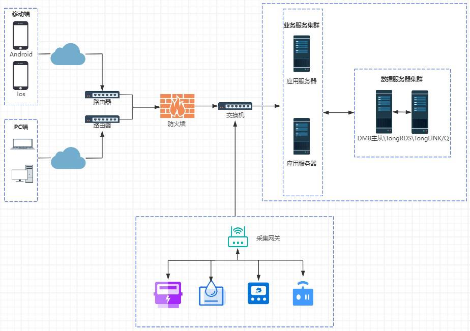 多端(PC、移動(dòng)端)通過(guò)局域網(wǎng)路由器和交換機(jī)等網(wǎng)絡(luò)設(shè)備訪問(wèn)服務(wù)器,服務(wù)器及時(shí)響應(yīng)數(shù)據(jù),應(yīng)用服務(wù)器和數(shù)據(jù)服務(wù)器采用2個(gè)節(jié)點(diǎn)的高可用部署。
