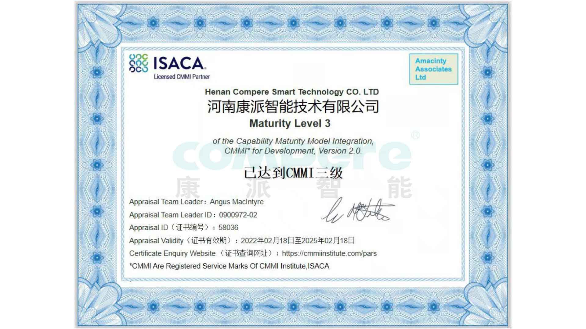 經ISACA(國際信息系統審計協會)的全面評估與審核,河南康派智能技術有限公司順利通過CMMI2.0-L3級認證!