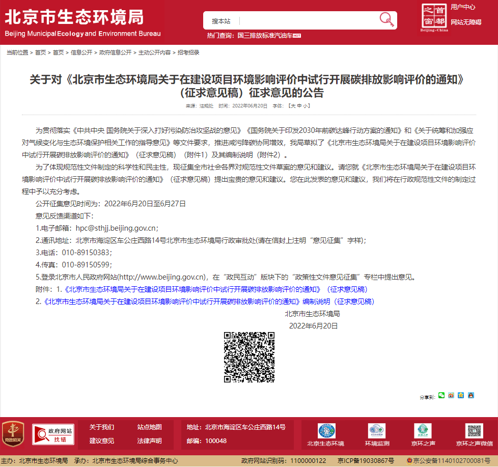 北京市生態(tài)環(huán)境局官網(wǎng)6月20日發(fā)布公告,就《北京市生態(tài)環(huán)境局關于在建設項目環(huán)境影響評價中試行開展碳排放影響評價的通知》(征求意見稿)公開征求社會各界意見。
