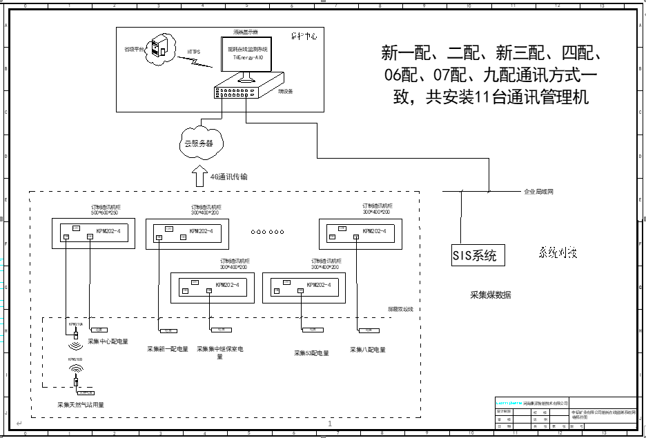 企業現有3條總進線,電廠1#聯絡變和電廠2#聯絡變兩條總進線進線柜位于35KV開閉所配電房內,需加裝2臺三相導軌式智能電力能效終端KPM37-W采集上傳數據;金雞灘變電主進線位于工業場地35KV配電房內,需加裝1臺三相導軌式智能電力能效終端KPM37-W采集上傳數據。兩個配電房各加裝1臺4G通訊管理機,將數據發送至內網主機。