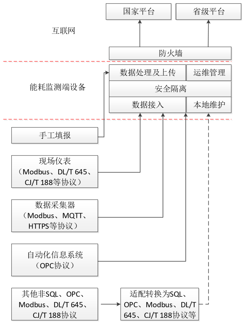 端設備支持SQL、OPC、MODBUS、DL/T 645、CJ/T188協(xié)議,能耗在線監(jiān)測端設備對采集到的數據進行匯總,驗證、篩選、整理打包后,采用“CA認證+HTTPS協(xié)議+VPN專線”方式多重加密將數據傳輸至省級平臺。